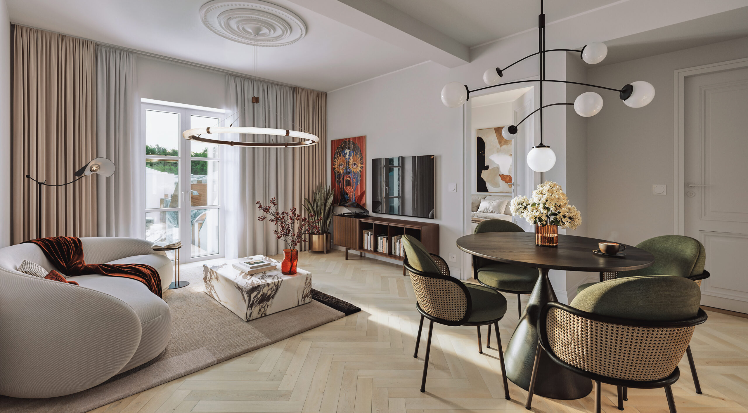 Tema loodud kontseptsioon toetub maja arhitektuursetele väärtustele, rõhutades ajatust, kvaliteeti ja terviklikku ruumikogemust.